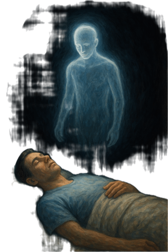 脳は夢を見ている状態(レム睡眠)にあるが、身体は動けない。そのとき「自分が寝ている姿を外から見る」体験が現れることもある。これが夢と覚醒意識の中間状態に起こるとすれば、幽体離脱は「心身の生理的状態」によって説明可能になる。